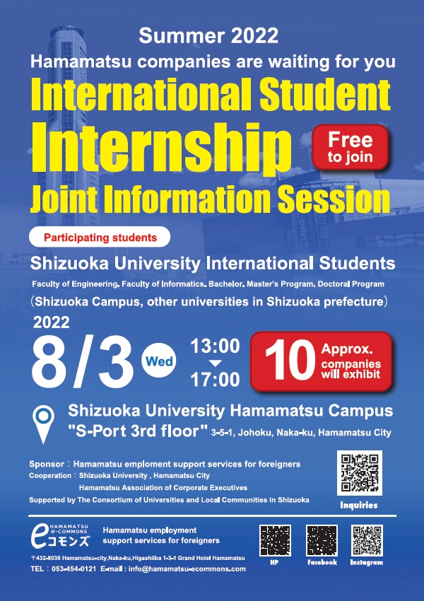 International Student Internships Fair 2022 Session: 3rd August e-Commons (Hamamatsu employment support services for foreigners) will hold an internship fair at Hamamatsu Campus.