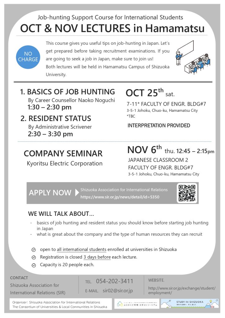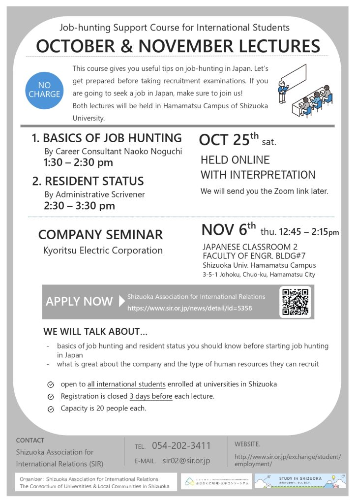 We will hold employment support workshops for international students on Saturday, October 25 and Thursday, November 6.