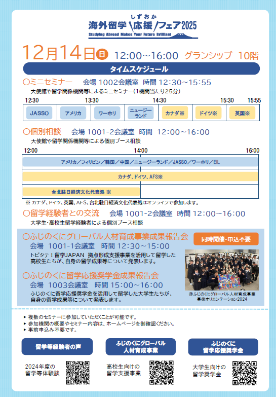 「ふじのくにグローバル人材育成事業成果報告会」「ふじのくに留学応援奨学金成果報告会」も同時開催、ミニセミナー・個別相談、留学経験者との交流もあります。