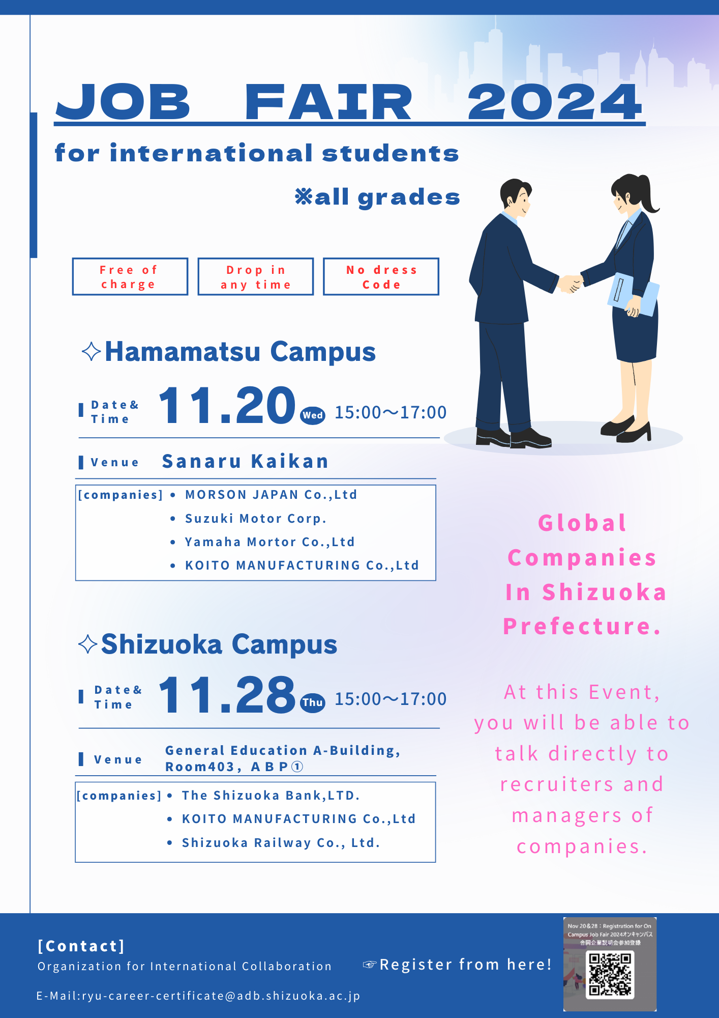 "Job Fair on campus for international students", Nov 20th (Hamamatsu) & 28th (Shizuoka)