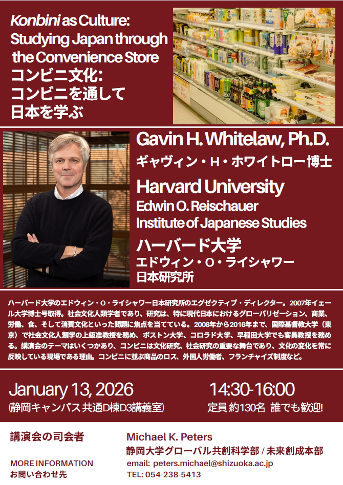 ハーバード大学のエドウィン・O・ライシャワー日本研究所のエグゼクティブ・ディレクター、ギャヴィン・H・ホワイトロー 博士の講演会が開催されます!