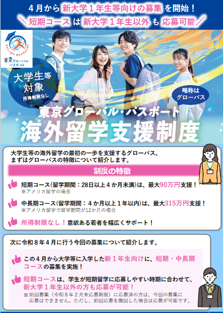 「東京グローバル・パスポート」は、大学生等を対象にした東京都独自の海外留学支援制度です。