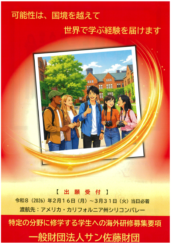 一般財団法人サン佐藤財団より、海外研修募集要項が届きました。