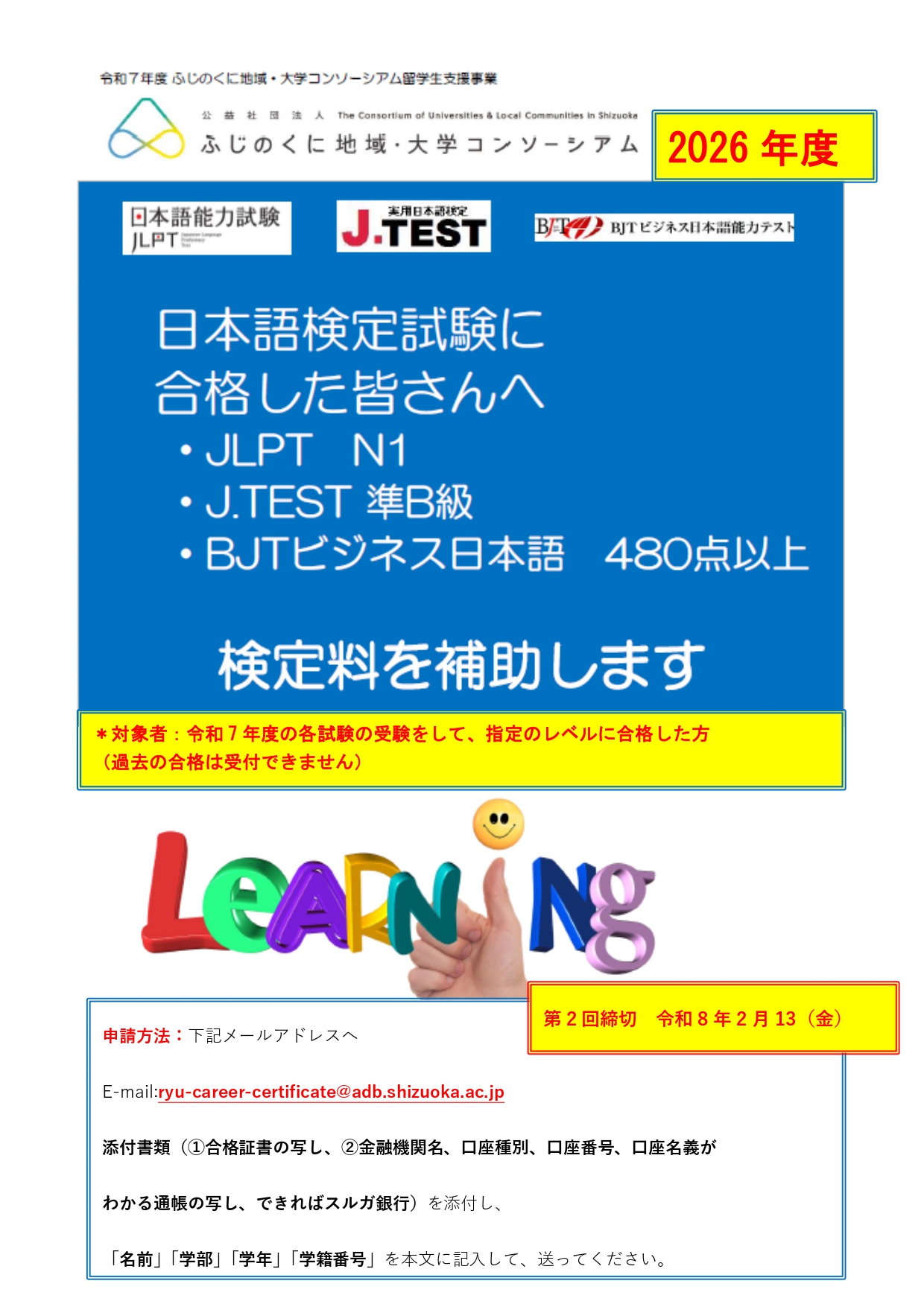 「令和7年度 日本語検定(JLPT、J.TEST、BJT)受験料補助のお知らせ」