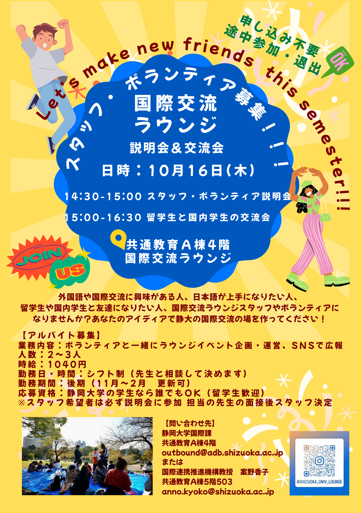 国際交流ラウンジスタッフやボランティアになりませんか?あなたのアイディアで静大の国際交流の場を作ってください!外国語や国際交流に興味のある人、日本語が上手になりたい人などなど…説明会&交流会でお待ちしています!