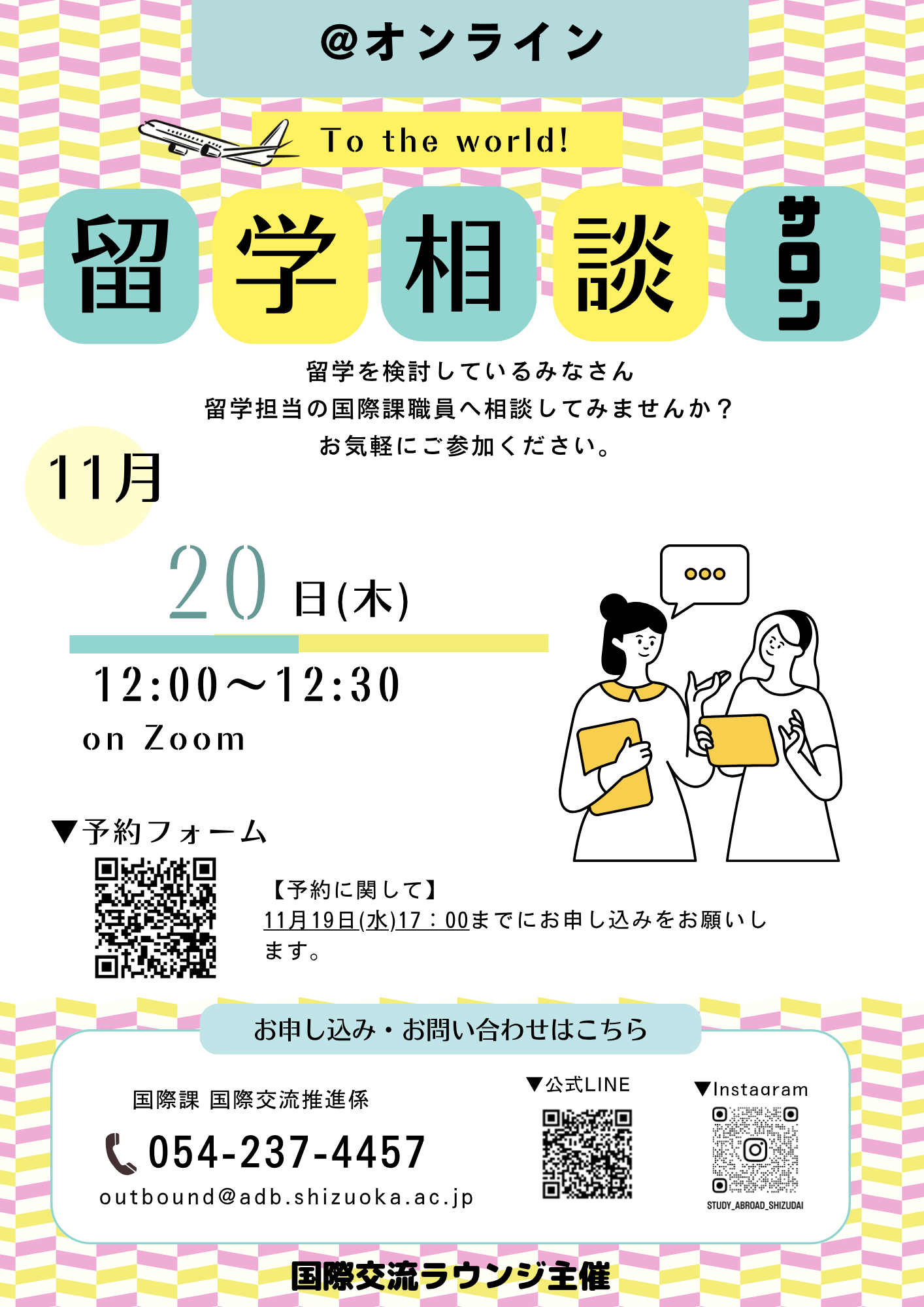 下記のとおり留学相談サロンを開催しますので、お気軽にご参加ください!