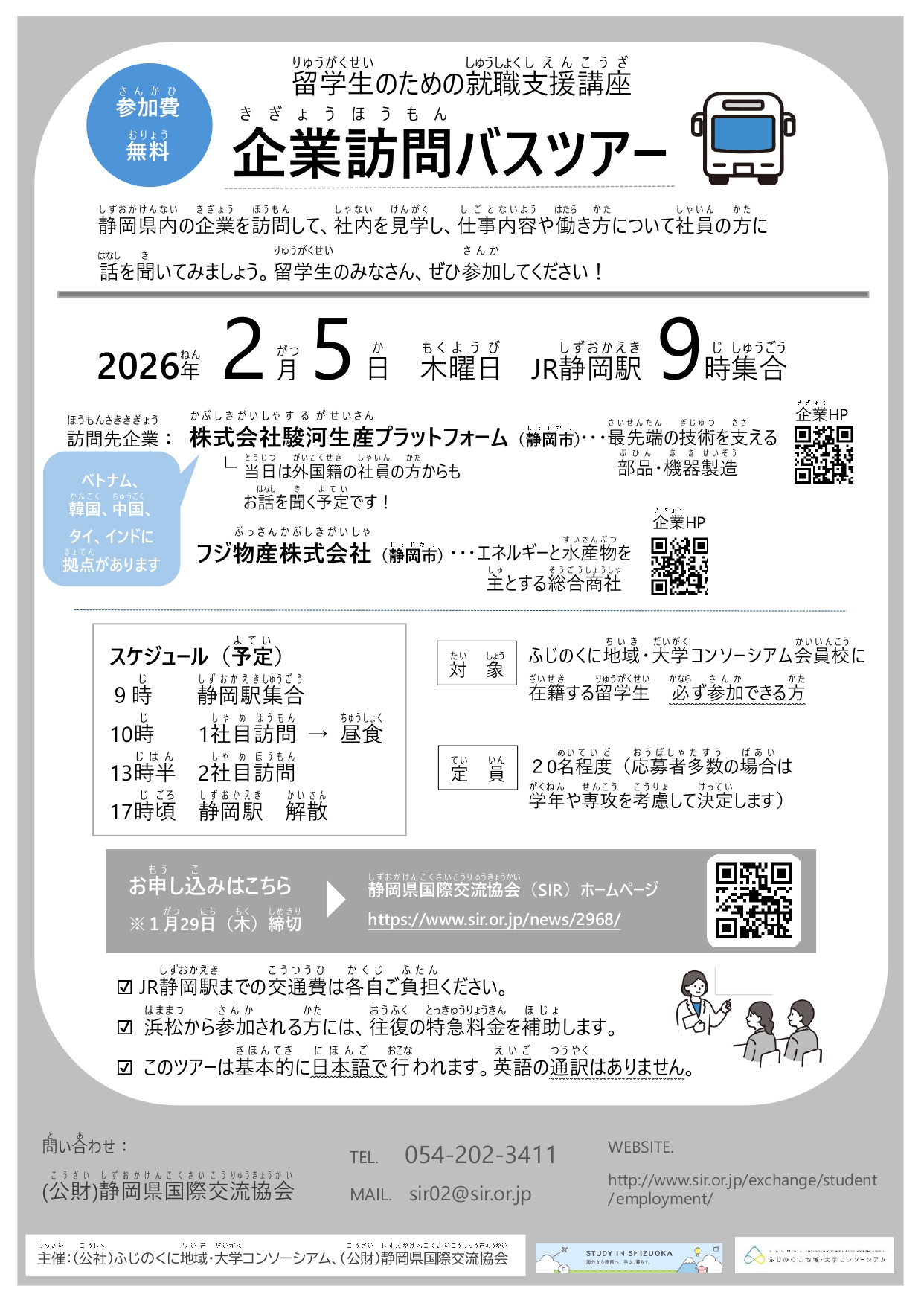 静岡県国際交流協会(SIR)様から企業訪問バスツアーのお知らせです。