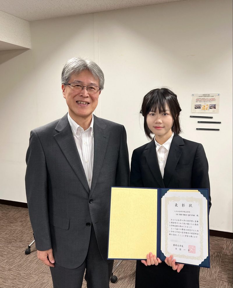 前年度の学業成績が極めて優秀な学生に贈られる本賞に留学生が選ばれるのは極めて難しく、今回の受賞者のうちQUYNHさんだけが留学生でした。7月13日(木)に日詰学長から表彰状が手渡され、前期授業料が全額免除されることとなりました。表彰式の様子(静岡大学公式HPへ)