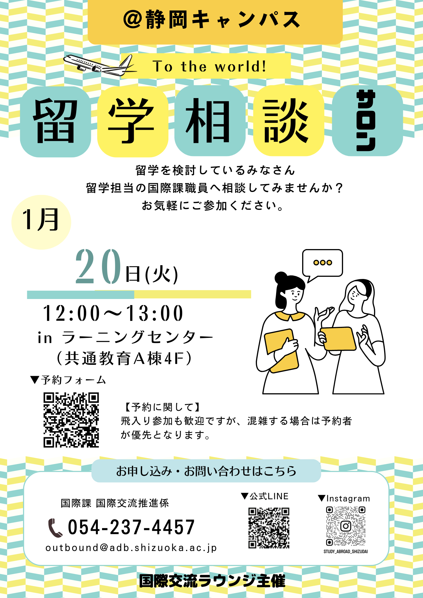 オンライン(Zoom)、メール、電話等で相談できますので、留学相談サロンへご都合がつかない方もお気軽にご相談ください。