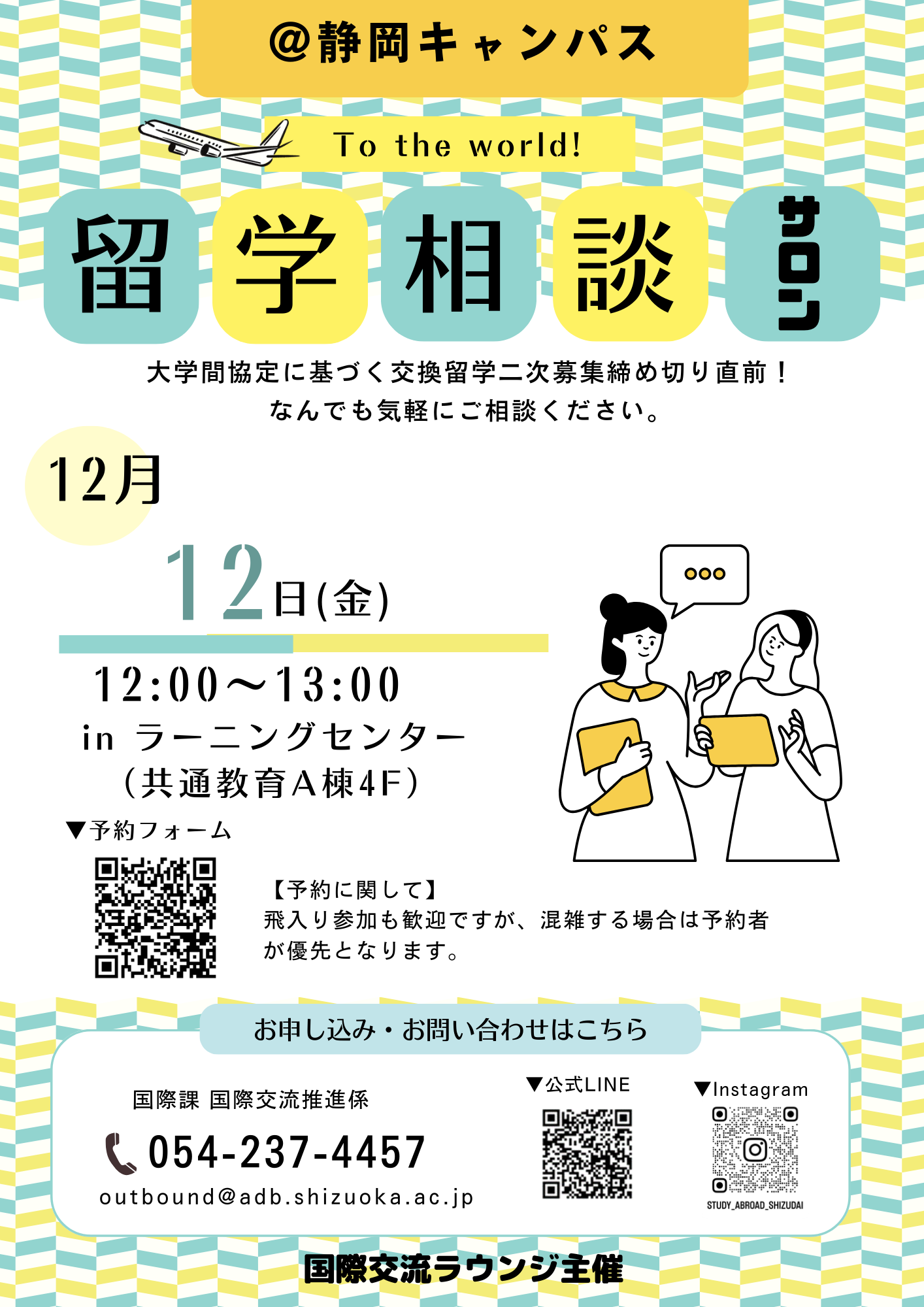 オンライン(Zoom)、メール、電話等でも相談できますので、留学相談サロンへご都合がつかない方もお気軽にご相談ください。