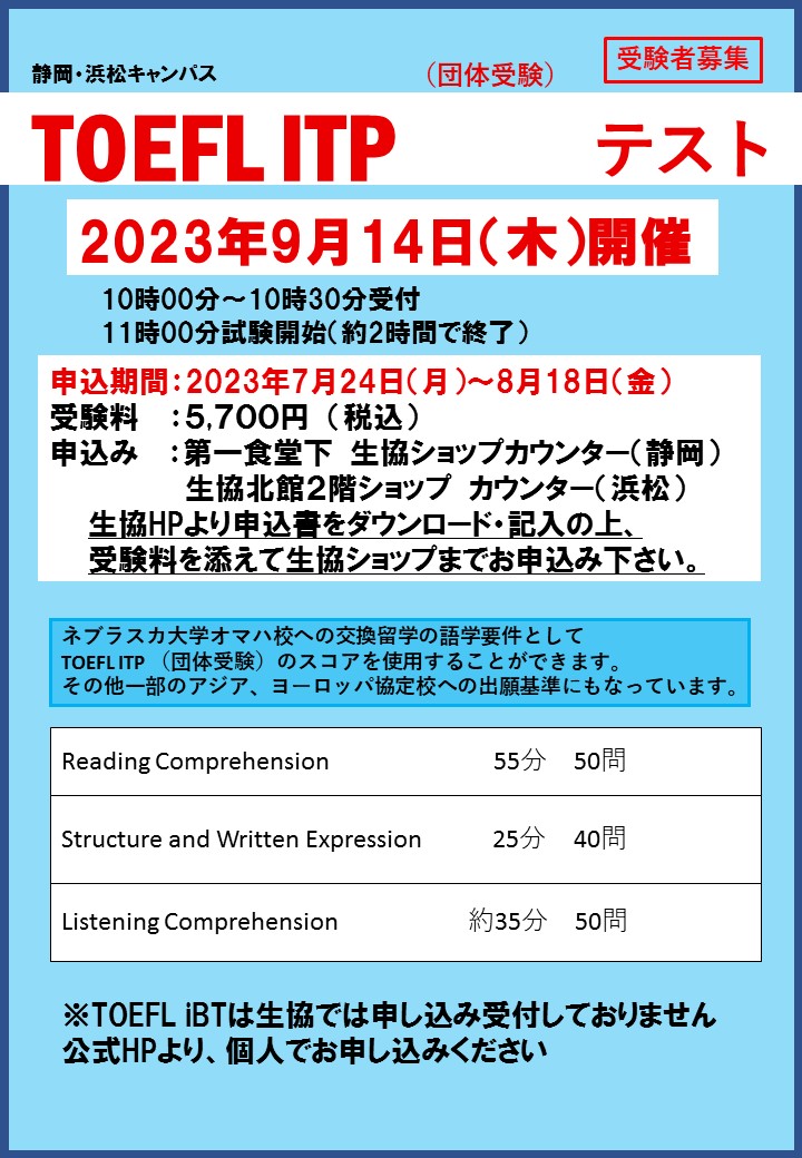 9月14日(木)に静岡キャンパス、浜松キャンパスの両キャンパスにてTOEFL ITPテストが開催されます。それぞれの詳細はチラシをご覧ください。※静岡・浜松キャンパス合わせて受験者申込者が締切日までに10人以上集まらない場合は中止となります。●TOEFL ITPテスト申込書