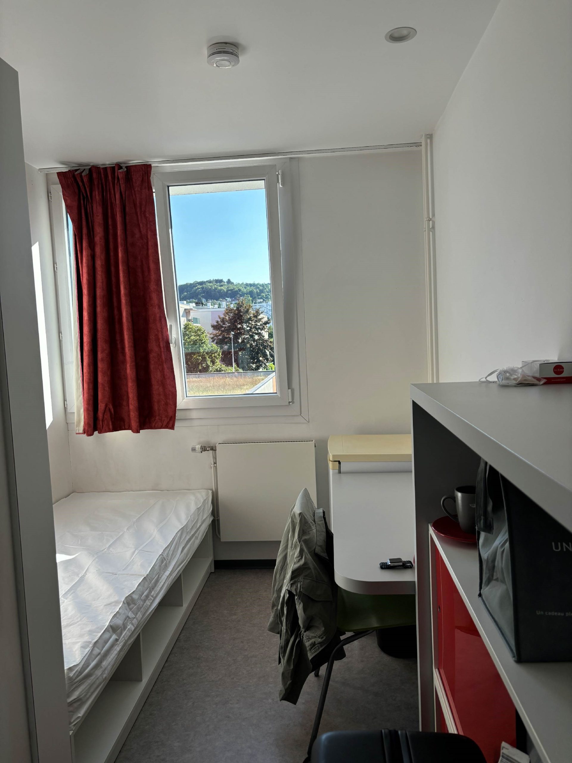 フランスでは、CROUSという学生寮に滞在していました。9 m²と決して広い部屋ではありませんでしたが、ベット、机、棚、トイレ、シャワー、冷蔵庫など必要なものは揃っていました。キッチンは各階で共有でしたが、家賃補助制度を利用して光熱費込みで月2万円で生活することができました。約1年という限られた期間の滞在だったので、十分でした。家賃は上がりますが、もっと広い部屋やキッチンのある部屋もあります。