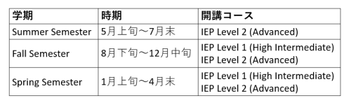 留学期間は、UNOアカデミックカレンダーに沿った1学期間です。学期によって開講されているコースが異なり、必要な英語レベル(受講要件)が設定されています。
