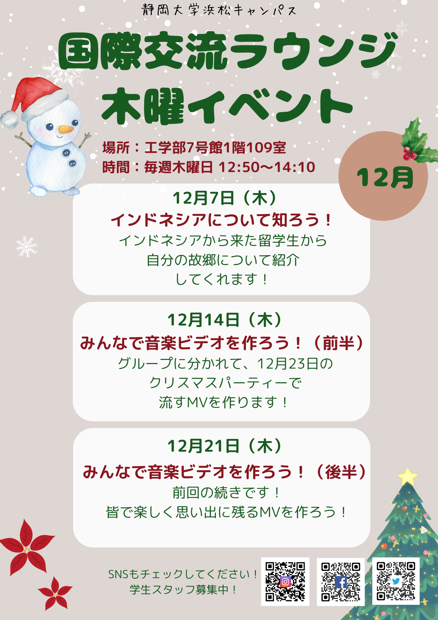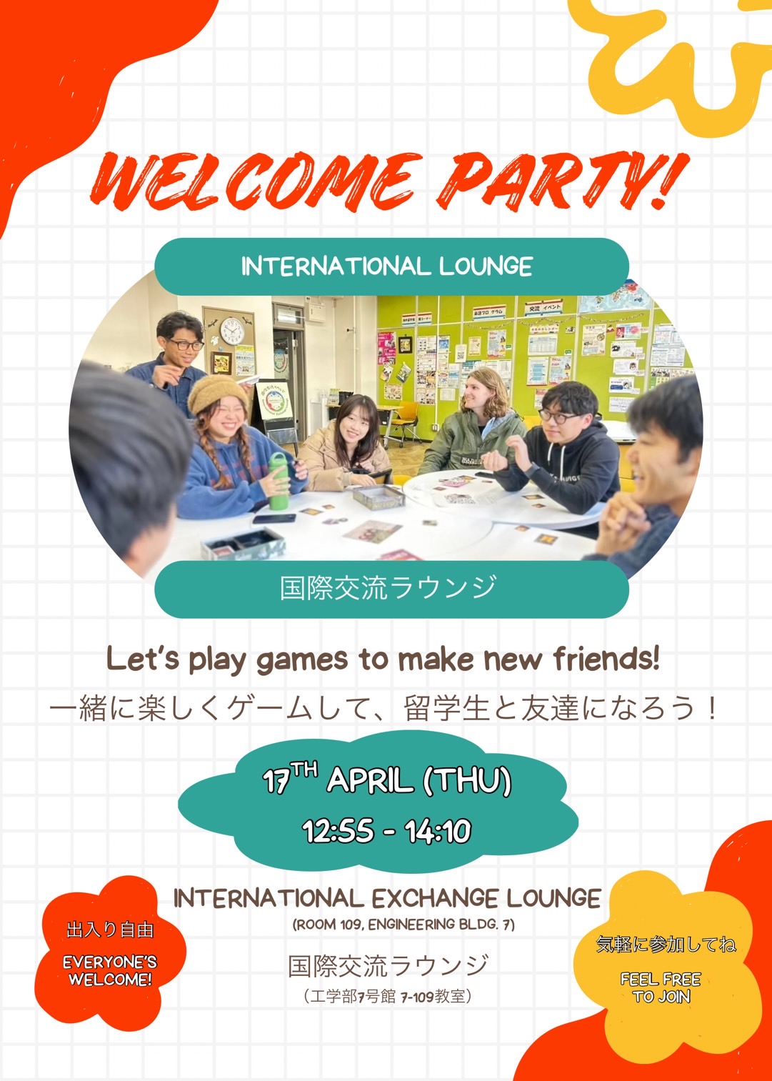 浜松キャンパスにも国際交流ラウンジが誕生!日本人学生と留学生の交流や語学学習をする場として、学生主体で様々なイベントを開催しています。いつでも誰でも歓迎します。予約不要!!